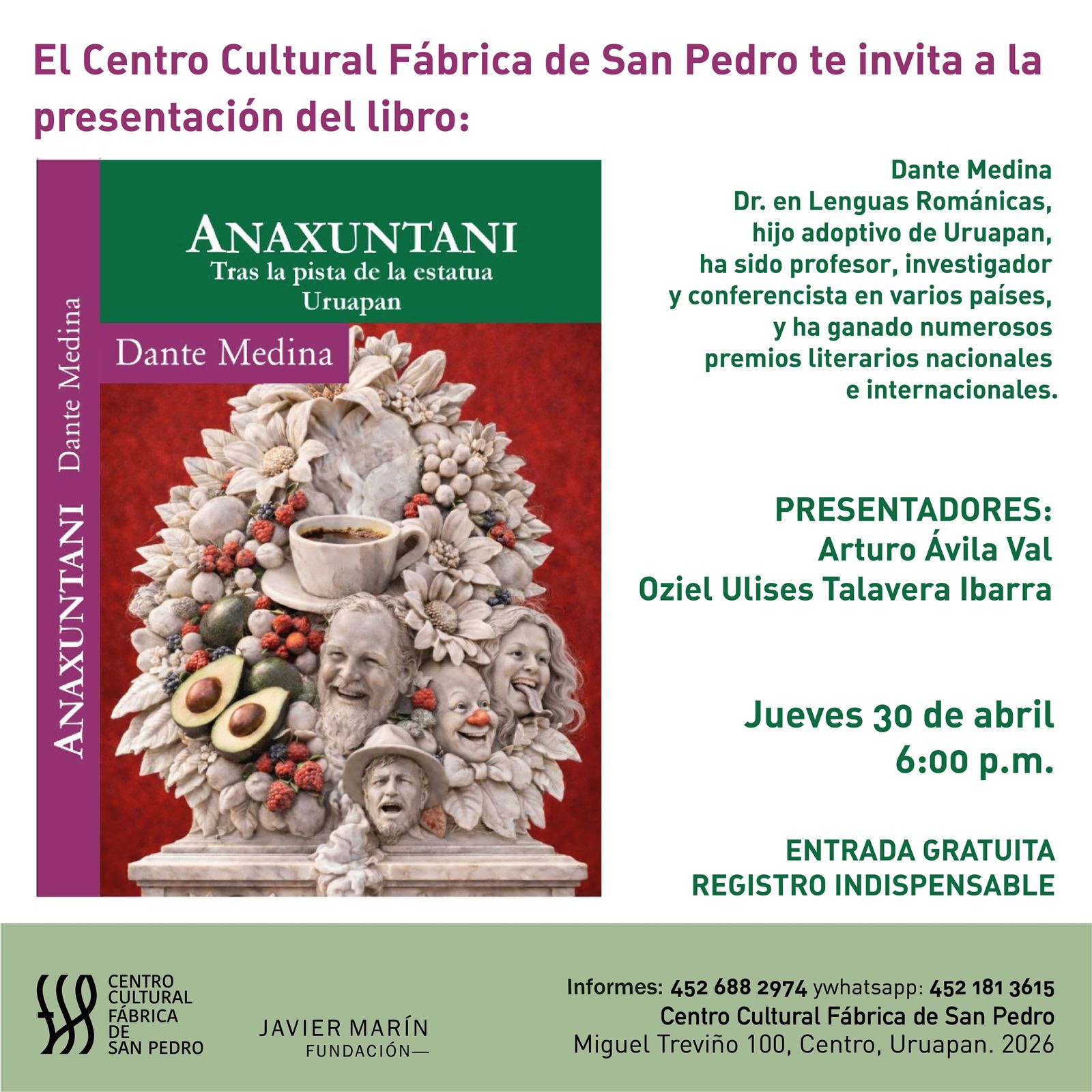 Dante Medina: Doctor en Lenguas Románicas, hijo adoptivo de Uruapan, ha sido profesor, investigador y conferencista en varios países y ganado numerosos premios literarios nacionales e internacionales.