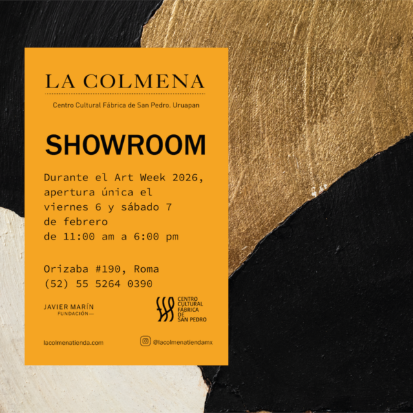 Showroom Durante el Art Week 2026, los esperamos en la apertura única del SHOWROOM de La Colmena el viernes 6 y sábado 7 de febrero de 11:00 am a 6:00 pm. Orizaba#190, Col. Roma, CdMx