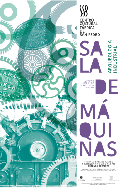 Más información »Exposición Sala de Máquinas: Arqueología Industrial A partir del 27 de marzo de 2026 de jueves a domingo de 12:00 a 7:00 pm Entrada libre Producción nacional de artes visuales realizada con el estímulo fiscal del artículo 190 de la LISR (EFIARTES) Centro Cultural Fábrica de San Pedro Miguel Treviño #100, Centro, Uruapan, Mich.