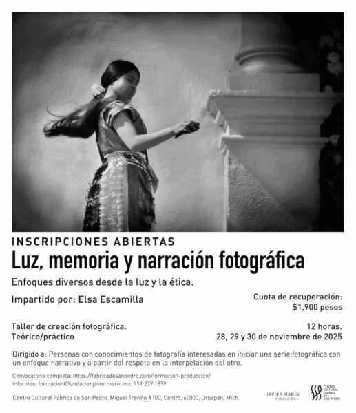 INSCRIPCIONES ABIERTAS Luz, memoria y narración fotográfica. Enfoques diversos desde la luz y la ética. Taller teórico práctico 12 horas. 28, 29 y 30 de noviembre de 2025 Dirigido a: Personas con conocimientos de fotografía interesadas en iniciar una serie fotográfica con un enfoque narrativo y a partir del respeto en la interpelación del otro.…